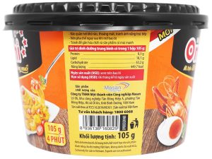SÚP – Nước, dầu thực vật, maltodextrin, đường, tương ớt, bột kem sữa, tỏi, hỗn hợp gia vị và thảo mộc, tôm khô 13,3 g/kg, cà chua cô đặc, bột thịt gà, muối, hành tây, me, chất điều vị (621, 635, 364ii), cà rốt sấy, nước mắm, bột trứng, hương phô mai trứng muối tổng hợp, hương tôm giống tự nhiên, bột tôm 3,6 g/kg, chiết xuất nấm men, chất điều chỉnh độ axit (330), chất làm dầy (1422, 415), chất tạo màu paprika oleoresin tự nhiên, đạm đậu nành thủy phân, chất bảo quản (202), chất chống đông vón (551), chất chống oxy hóa (320, 321). Sản phẩm chứa các nguyên liệu có nguồn gốc từ lúa mì, thuỷ sản, đậu nành, sữa, trứng. |