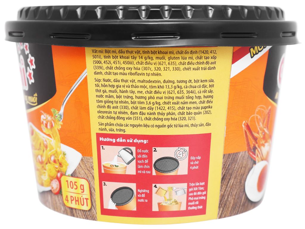 SÚP – Nước, dầu thực vật, maltodextrin, đường, tương ớt, bột kem sữa, tỏi, hỗn hợp gia vị và thảo mộc, tôm khô 13,3 g/kg, cà chua cô đặc, bột thịt gà, muối, hành tây, me, chất điều vị (621, 635, 364ii), cà rốt sấy, nước mắm, bột trứng, hương phô mai trứng muối tổng hợp, hương tôm giống tự nhiên, bột tôm 3,6 g/kg, chiết xuất nấm men, chất điều chỉnh độ axit (330), chất làm dầy (1422, 415), chất tạo màu paprika oleoresin tự nhiên, đạm đậu nành thủy phân, chất bảo quản (202), chất chống đông vón (551), chất chống oxy hóa (320, 321). Sản phẩm chứa các nguyên liệu có nguồn gốc từ lúa mì, thuỷ sản, đậu nành, sữa, trứng. |