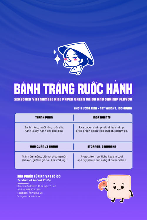 Thành phần: Bánh tráng, muối tôm, sốt bò, hành lá sấy, hành phi, dầu điều.