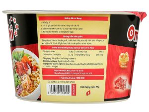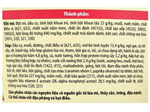 SÚP – Nước, dầu thực vật, muối, đường, chất điều vị (621, 635, 364ii), hỗn hợp gia vị và thảo mộc, mỡ bò (14,3 g/kg), ngò gai, cà rốt sấy (11,9 g/kg), hành tây, cà chua cô đặc, ớt (8,2 g/kg), tỏi, hương tổng hợp (hương bò hầm, hương bò, hương ngò gai), hỗn hợp gluten lúa mì, nước tương, hành lá sấy, tinh bột biến tính (1422), chiết xuất nấm men, nước cốt xương thịt (nước, xương ống, thịt heo, muối, chất bảo quản (211)) (750mg/kg), màu thực phẩm (150a, 160c), chất bảo quản (211), chất làm dày (415), chất chống oxy hóa (320, 321). Sản phẩm chứa các nguyên liệu có nguồn gốc từ lúa mì, thuỷ sản, trứng, đậu nành. Có thể chứa vết đậu phộng và hạt điều. |
