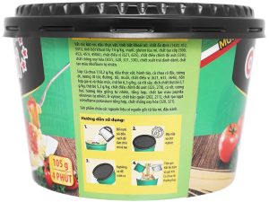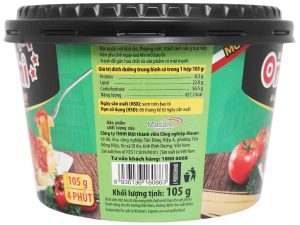 VẮT MÌ – Bột mì, dầu thực vật, tinh bột khoai mì, chất ổn định (1420, 412, 501i), tinh bột khoai tây 14g/kg, muối, gluten lúa mì, chất tạo xốp (500i, 452i, 451i, 450ii), chất điều vị (621, 635), chất điều chỉnh độ axit (339i), chất chống oxy hóa (307c, 320, 321, 330), chiết xuất trái dành dành, chất tạo màu riboflavin tự nhiên.